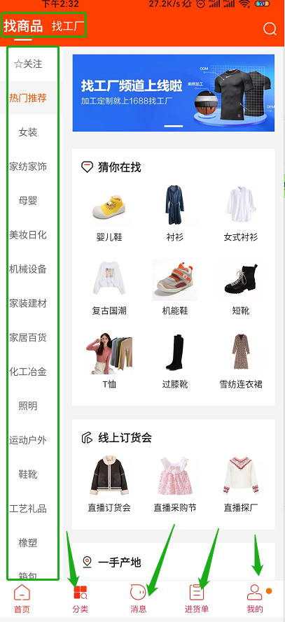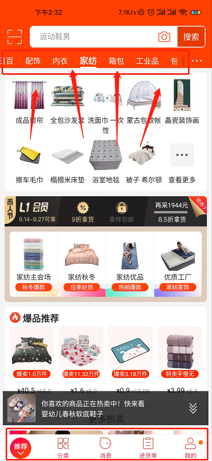 讲真的,阿里巴巴就是个商品更加齐全的淘宝,在淘宝的首页下栏是将淘宝的微淘换成了分类。