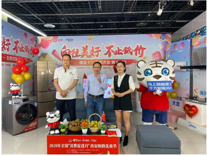 而在国美西安的十一大促活动现场,陕西省扶贫办主任余毅、陕西广播电视台主持人焦豆及西安国美总经理党小兵共同出现在直播间,一起为陕西国家地理标志产品大荔冬枣和周至猕猴桃,以及严选的畅销家电、百货等产品助力。