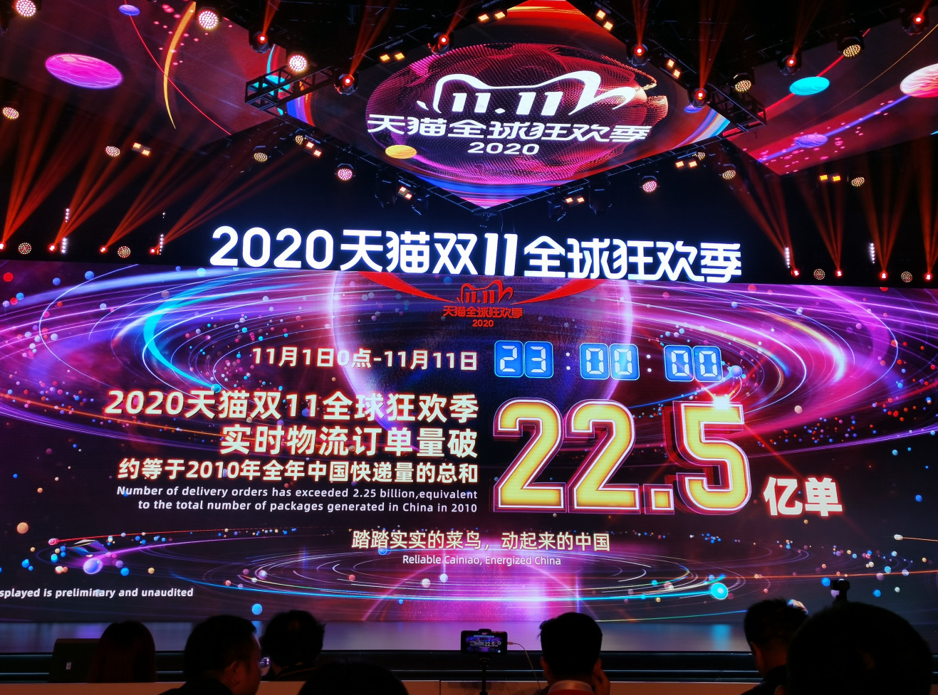 11月11日消息,《电商报》获悉,截至11月11日23时,2020天猫双11全球狂欢季实时物流订单量突破22.5亿单,约等于2010年全年中国快递量的总和。