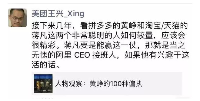 按王兴的说法,蒋凡是要打败黄峥后,才能顺利成为接班人,才能成为笑到最后的人。